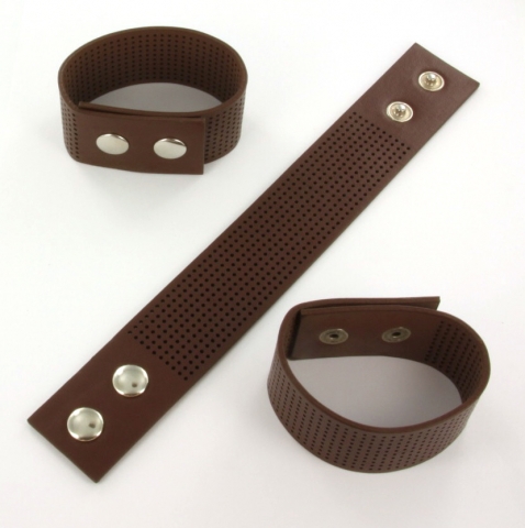 Op deze leren armband kun je door de gaatje in allerlei patronen de kralen erop rijgen. Dit kunnen alle ronde kraaltjes zijn, ook Miyuki, door een aantal per keer in een boogje te rijgen, maar ook bijvoorbeeld staafjes die net zo breed zijn als de gaatjes.