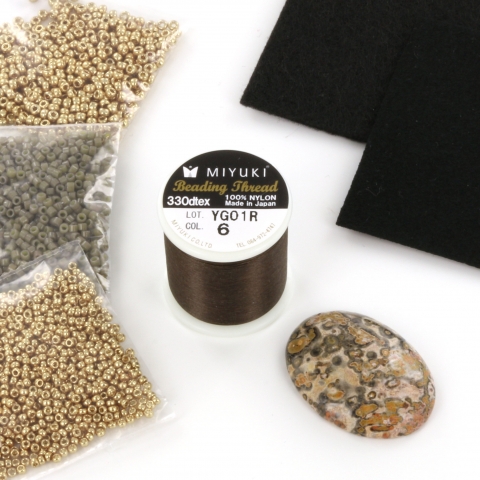 Met dit complete basispakket kun je direct starten met bead embroidery. In dit pakket zit een klein stukje beading foundation en ultrasuede van 5 x 5 cm, genoeg om een hanger of broche te maken. Daarnaast een cabochon, met 3 passende kleuren Miyuki kralen en de juiste kleur draad. Je kunt hiermee een prachtige ingepakte cabochon maken, die je kunt bevestigen aan een ketting, of waar je een broche mee maakt.