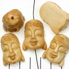 De kraal is gemaakt van koeienbot. De buddha is met de hand gesneden. De kleur, maat en tekening varieert daarom. De achterkant is glad. De onderkant en bovenkant zijn gevormd en getekend.