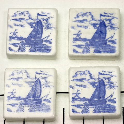 Deze tegeltjes zijn aan beiden kanten hetzelfde versierd. Het plaatje is niet altijd op precies dezelfde plek (bijvoorbeeld iets meer naar links of naar rechts). Deze kralen zijn horizontaal geboord, dus het gat loopt van links naar rechts.