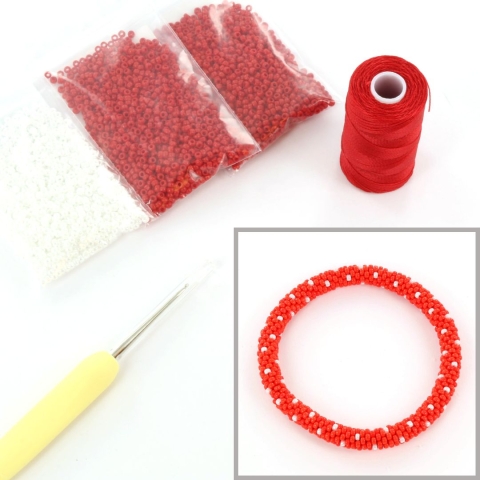 Met dit pakket kun je zelf een superleuke bangle maken door deze te haken met 11/0 rocailles. Je ontvangt de kleuren die in dit pakket zitten, samen met de kleur rijgkoord (0.3 mm dik) dat er goed bij past. Zo hoef je zelf niet meer uit te zoeken wat je ervoor nodig hebt en heb je geen twijfel over de kleuren.