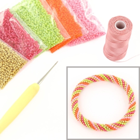 Met dit pakket kun je zelf een superleuke bangle maken door deze te haken met 11/0 rocailles. Je ontvangt de kleuren die in dit pakket zitten, samen met de kleur rijgkoord (0.3 mm dik) dat er goed bij past. Zo hoef je zelf niet meer uit te zoeken wat je ervoor nodig hebt en heb je geen twijfel over de kleuren.