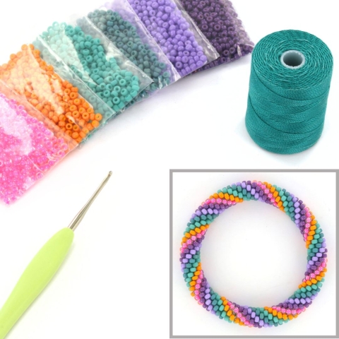 Met dit pakket kun je zelf een superleuke bangle maken door deze te haken met 8/0 rocailles. Je ontvangt de kleuren die in dit pakket zitten, samen met de kleur rijgkoord (0.5 mm dik) dat er goed bij past. Zo hoef je zelf niet meer uit te zoeken wat je ervoor nodig hebt en heb je geen twijfel over de kleuren. In dit pakket zitten genoeg kralen om 2 armbanden te maken.