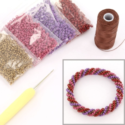 Met dit pakket kun je zelf een superleuke bangle maken door deze te haken met 8/0 en 11/0 rocailles. Je ontvangt de kleuren die in dit pakket zitten, samen met het kleur rijgkoord (0.3 mm dik) dat er goed bij past. Zo hoef je zelf niet meer uit te zoeken wat je ervoor nodig hebt en heb je geen twijfel over de kleuren.