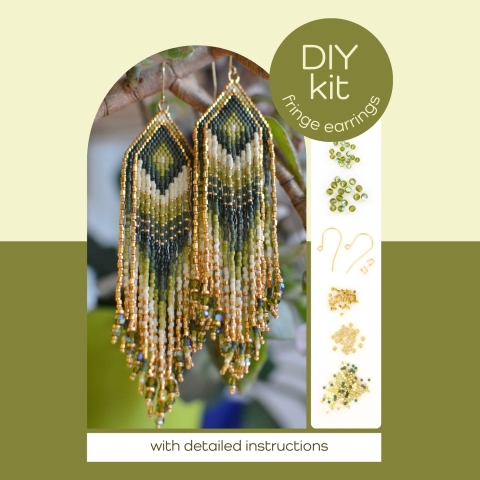 DIY kit voor het maken van prachtige bohemian fringe oorbellen door middel van de brick stitch rijgtechniek. Alle benodigde kralen en onderdelen zitten erin, samen met een uitgebreide uitleg om deze oorbellen te maken. De oorbellen zullen ongeveer 12-15 cm lang worden, afhankelijk je keuze of je het lange of kortere patroon volgt (beiden inbegrepen in de tutorial).