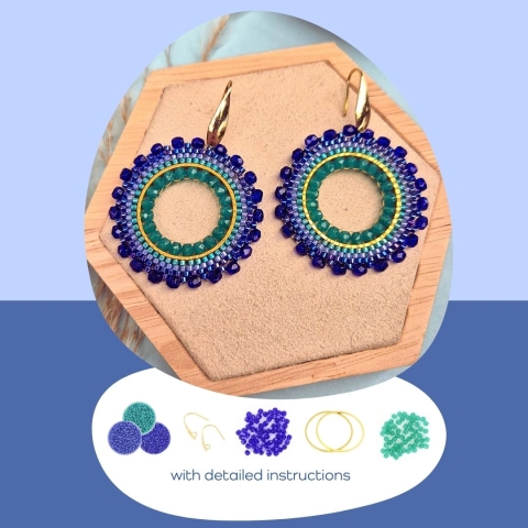DIY kit voor het maken van prachtige ronde oorbellen door middel van de brick stitch rijgtechniek. Alle benodigde kralen en onderdelen zitten erin, samen met een uitgebreide uitleg om deze oorbellen te maken. De oorbellen zullen in de diameter ongeveer 4 cm groot worden.