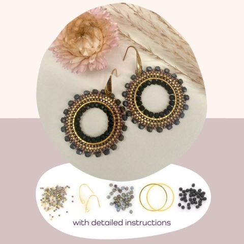 DIY kit voor het maken van prachtige ronde oorbellen door middel van de brick stitch rijgtechniek. Alle benodigde kralen en onderdelen zitten erin, samen met een uitgebreide uitleg om deze oorbellen te maken. De oorbellen zullen in de diameter ongeveer 4 cm groot worden.