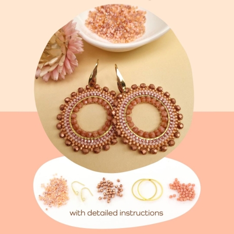 DIY kit voor het maken van prachtige ronde oorbellen door middel van de brick stitch rijgtechniek. Alle benodigde kralen en onderdelen zitten erin, samen met een uitgebreide uitleg om deze oorbellen te maken. De oorbellen zullen in de diameter ongeveer 4 cm groot worden.