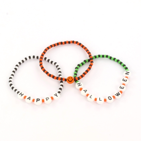 Setje voor DIY-armbandjes. Rijg je eigen combinaties met de Halloween kralen set, die bestaan uit Miyuki elastiek, Miyuki rocailles 8/0, letterkralen en een zakje smileys