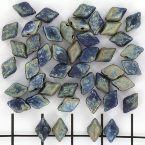 De gemduo is een Tsjechische glaskraal van van 5 mm breed en 8 mm hoog met een dikte van 3.5 mm. Deze ruitvormige kraal beschikt over twee gaten. De unieke vorm en rechte lijnen zorgen er voor dat deze kralen goed op elkaar aansluiten.
