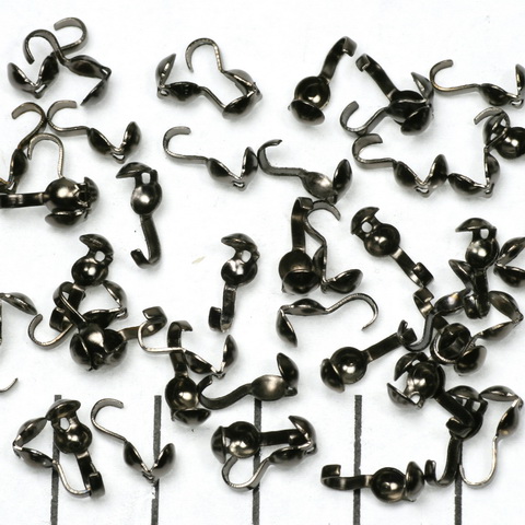 Aan het oogje van het kalotje kun je nu je sluiting verder bevestigen om het goed af te werken. Er passen circa 4 draden doorheen. De knijpkraal waarmee je het afwerkt kan het beste maximaal 2 mm groot zijn. Zie eventueel Kralen.com voor instructies.