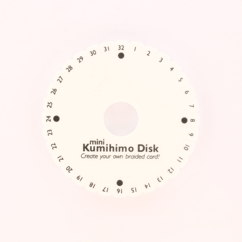 Deze Kumihimo schijf werkt heel fijn. De schijf is 15 cm breed en het gat in het midden is 2,4 cm. Rondom zitten 32 inkepingen waar het draad makkelijk en stevig vastgezet kan worden.