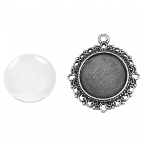 metalen cabochon hanger versierd - 32 mm rond zilver