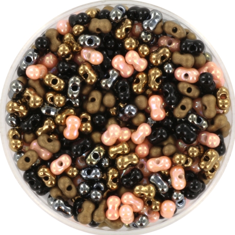 De vorm van de berry bead lijkt op de vorm van cijfer 8 of zoals de vorm van een pinda. Wanneer je ze achter elkaar rijgt, dan komen ze vanzelf om en om in elkaar te liggen. Zo kun je ze leuk afwisselen met rocailles in een ketting of brillenkoord.