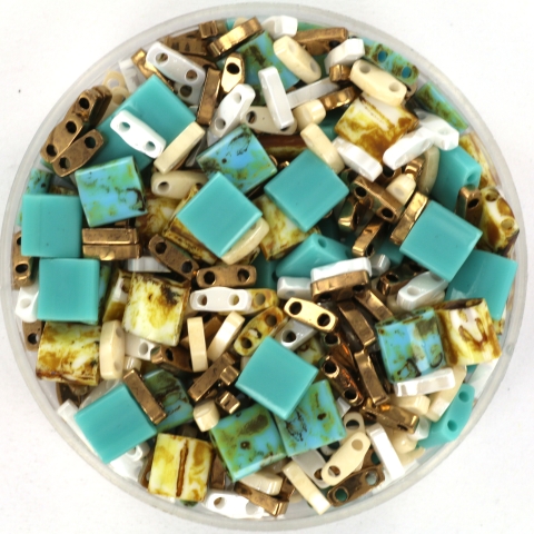 De mixen met tila's bestaan uit hele, halve en quarter tila's, die perfect samen gebruikt kunnen worden in een sieraad. De hele tila's zijn 5 x 5 mm, de halve tila's zijn 2,5 x 5 mm en de quarter tila's zijn 1,25 x 5 mm. Hiermee is de breedte van de verschillende tila's altijd exact 5 mm en sluiten ze dus heel mooi op elkaar aan.
