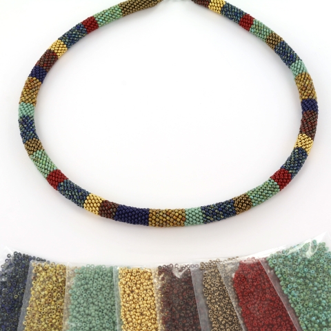 Voor het maken van deze mooie ketting in aardetinten hebben we gekozen om gebruik te maken van rocailles 11/0 in verschillende kleuren van onze picasso kralen. Deze hebben we gecombineerd met bijpassende, egaal-gekleurde rocailles 11/0.