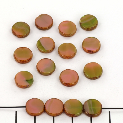 table cut disc 10 mm - pink coral / olivine - picasso