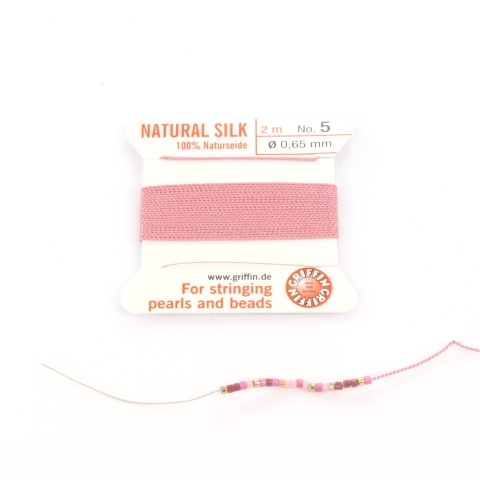 Griffin 100% natuurlijk zijden draad nr 5. Op het kaartje zit 2 meter zijden draad van 0.65 mm dikte met een handige naald aan de draad.