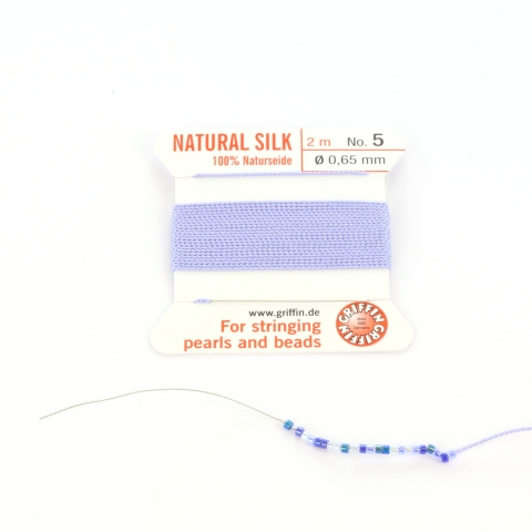 Griffin 100% natuurlijk zijden draad nr 5. Op het kaartje zit 2 meter zijden draad van 0.65 mm dikte met een handige naald aan de draad.