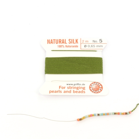 Griffin 100% natuurlijk zijden draad nr 5. Op het kaartje zit 2 meter zijden draad van 0.65 mm dikte met een handige naald aan de draad.