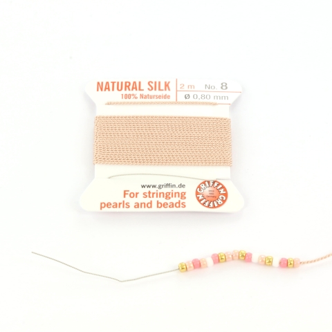 Griffin 100% natuurlijk zijden draad nr 8. Op het kaartje zit 2 meter zijden draad van 0.80 mm dikte met een handige naald aan de draad.