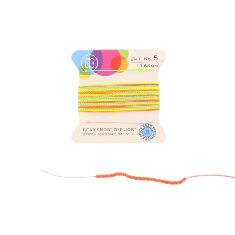 Griffin 100% natuurlijk zijden draad nr 5. Op het kaartje zit 2 meter zijden draad van 0.65 mm dikte met een handige naald aan de draad. Dit neon regenboogdraad is UV-fluoriserend. Let op, dit draad heeft subtiele kleurvariaties ieder kaart is uniek.