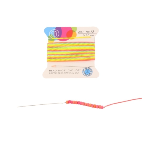 Griffin 100% natuurlijk zijden draad nr 8. Op het kaartje zit 2 meter zijden draad van 0.80 mm dikte met een handige naald aan de draad. Dit Neon regenboogdraad is UV-fluoriserend. Let op, dit draad heeft subtiele kleurvariaties ieder kaart is uniek.