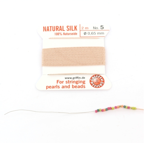 Griffin 100% natuurlijk zijden draad nr 5. Op het kaartje zit 2 meter zijden draad van 0.65 mm dikte met een handige naald aan de draad.
