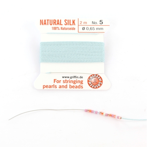 Griffin 100% natuurlijk zijden draad nr 5. Op het kaartje zit 2 meter zijden draad van 0.65 mm dikte met een handige naald aan de draad.